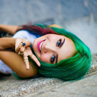 green hair, lying on their stomach with one hand resting under their cheek. They appear to be smiling and making