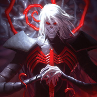 white hair and is wearing a dark armor with red accents and a skull-like visage on their chest, which suggests they may represent death or destruction. The background is ominous, with