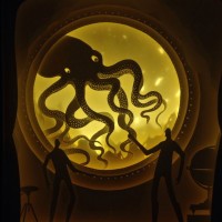 human figures and one octopus. One figure is standing, another appears to be sitting on a chair, and the third seems to be playing an instrument. The octopus is prominently displayed in the center, seemingly swimming or floating above the ground. The background features a stylized moon, enhancing the nocturnal