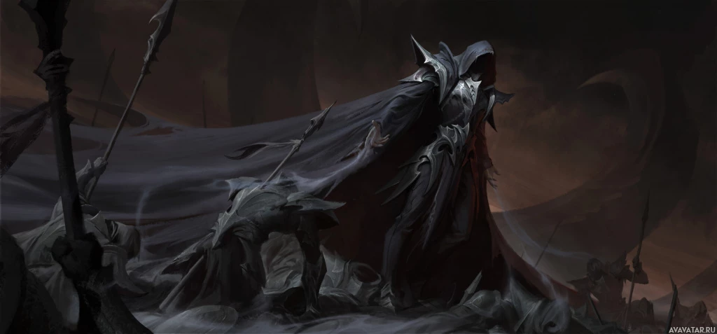 an impression of mystique or power. They are holding what seems to be a staff or wand, further suggesting a magical or supernatural role. The background has a dark and ominous atmosphere, with