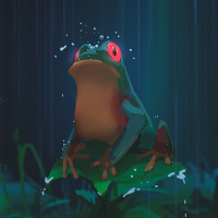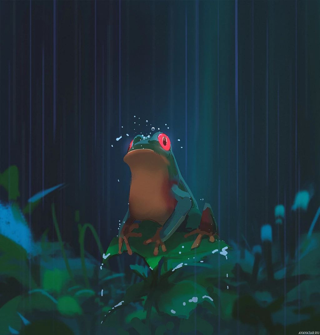 На картинке изображена лягушка во время дождя. Она сидит на чем-то похожем на лист или растение, а фон напоминает дождливую ночь с падающими сверху капельками воды.