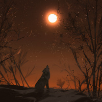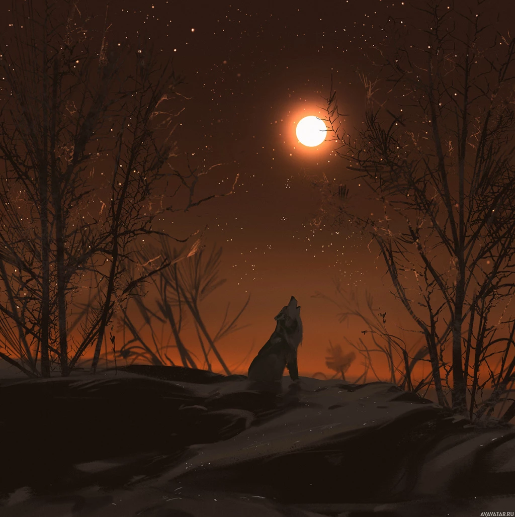 a full moon visible in the sky. The surroundings appear to be cold and barren, possibly during winter or