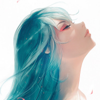 The image depicts an illustrated character, a girl with turquoise hair and closed eyes. She has a soft and contemplative expression on her face. There are also some light pink petals or particles around her head, which add a gentle touch to the scene. The overall feel of the image is one of tranquility and introspection.