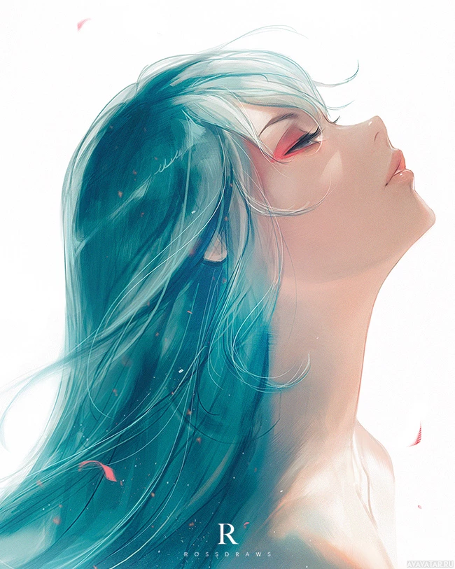 На картинке изображен иллюстрированный персонаж, девушка с бирюзовыми волосами и закрытыми глазами. У нее мягкое и задумчивое выражение лица. Вокруг ее головы также есть несколько светло-розовых лепестков или частиц, которые придают сцене нежный оттенок. Общее впечатление от изображения - это ощущение спокойствия и самоанализа.