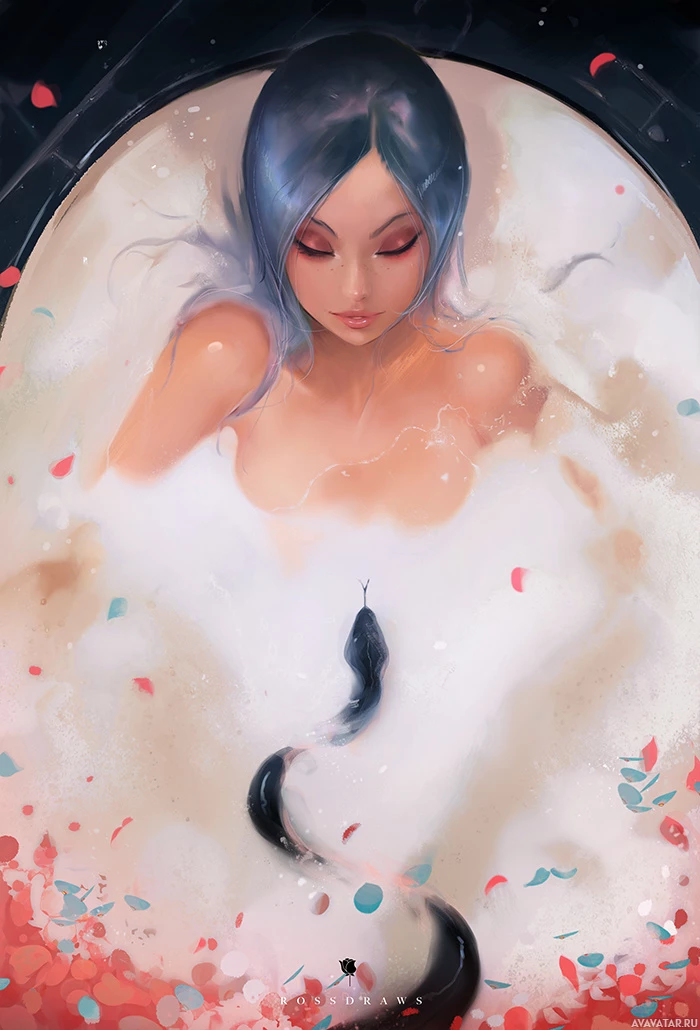 a black snake or serpent curled around her neck, adding an element of fantasy or mythology to the scene. The artwork is rich in detail and color, with a focus on creating