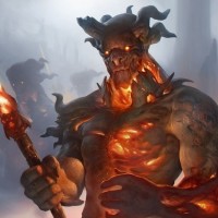 glowing eyes, and an overall intense expression. The creature is holding what seems to be a staff or weapon with fire at its end. This type of imagery is commonly associated with