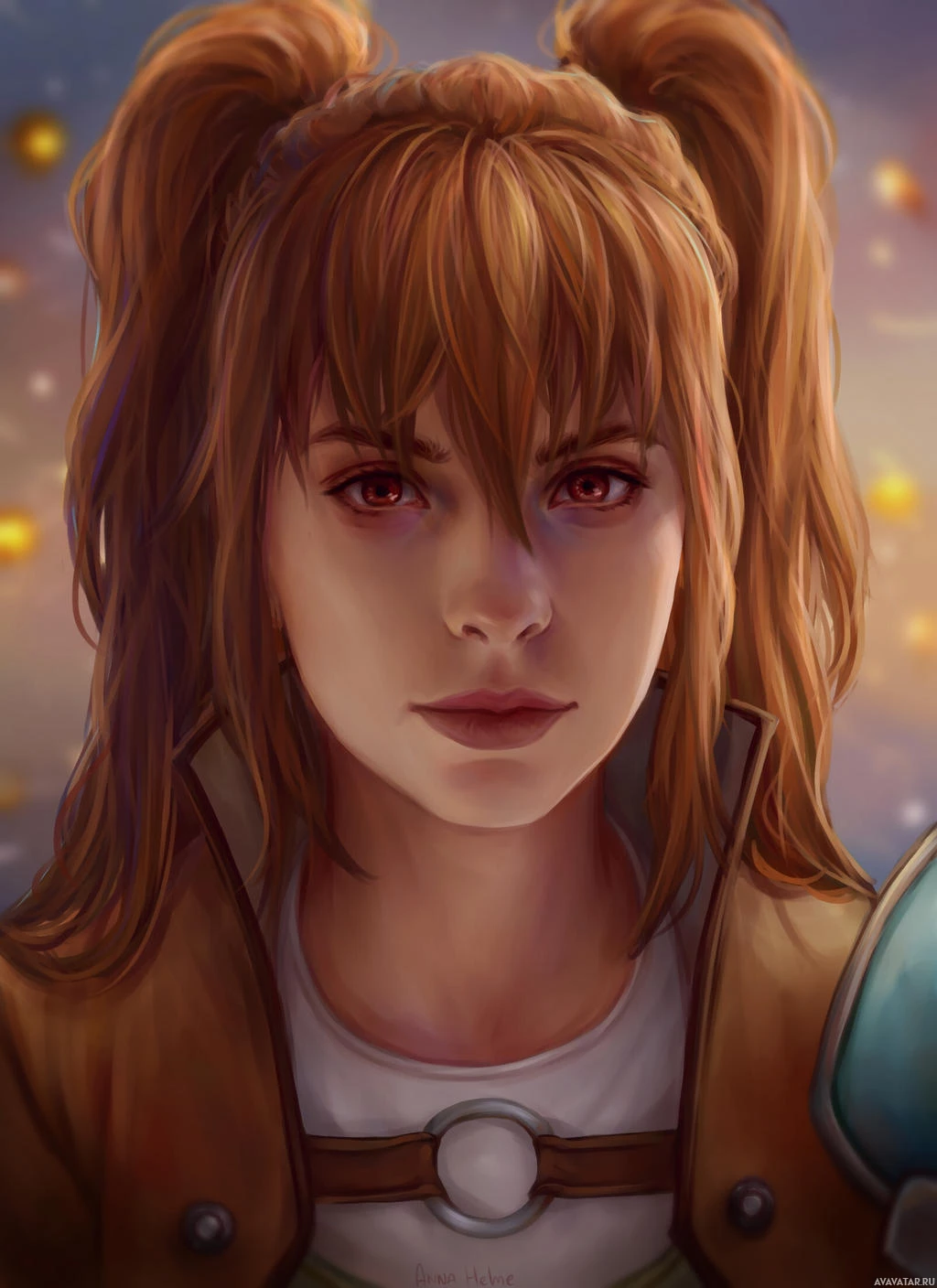 red hair styled in pigtails and is wearing what seems to be armor with a shield, suggesting she might be a warrior or fighter archetype within the narrative. Her expression is neutral, and her gaze is directed off to the side, which could indicate that she is observing something beyond the frame of the image. The background has a blurred effect, but it gives an impression of