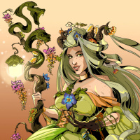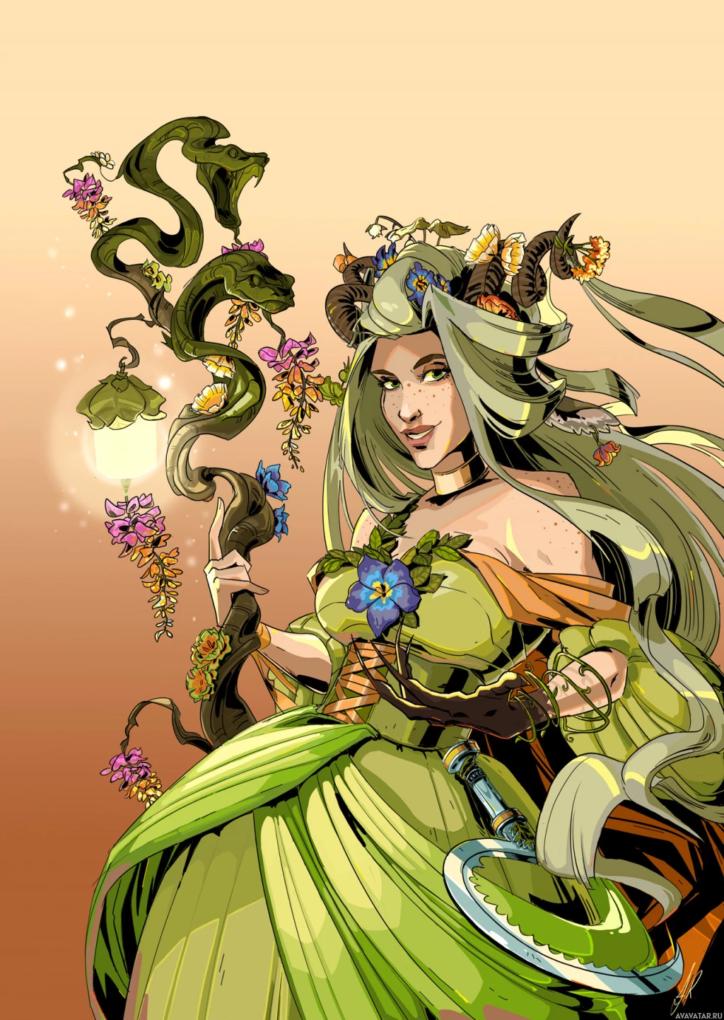 floral patterns suggesting a connection to nature. In her left hand, she holds a wand adorned with flowers and vines, which could indicate the character's role as a magical or healing figure. The background is warm and inviting, possibly indicating a forest or garden setting, which would fit the fantasy theme of the image.