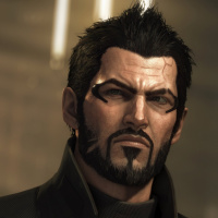 This image features a character from the video game "Deus Ex." The character is depicted with a rugged appearance, sporting facial hair and cybernetic enhancements, which are typical of the game's style. The setting appears to be a futuristic environment that could be part of the game's narrative or concept art.