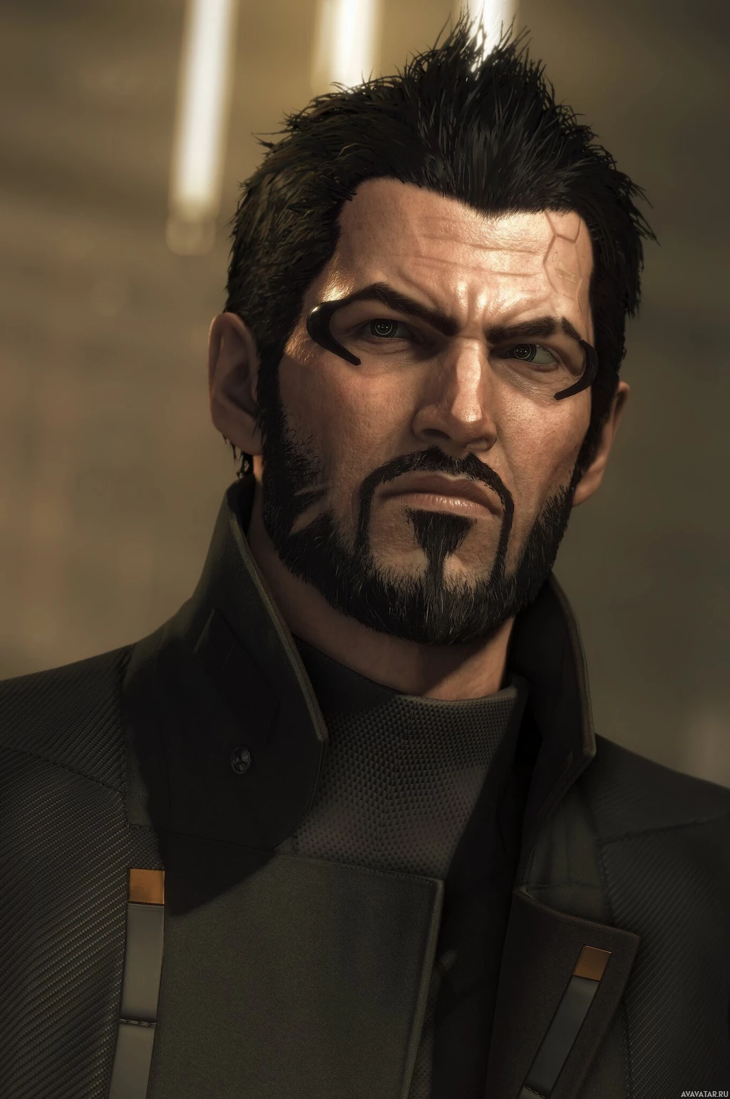 На этом изображении изображен персонаж из видеоигры "Deus Ex". Персонаж изображен с суровой внешностью, растительностью на лице и кибернетическими усовершенствованиями, которые типичны для стиля игры. Сеттинг выглядит как футуристическая среда, которая могла бы стать частью игрового повествования или концепт-арта.