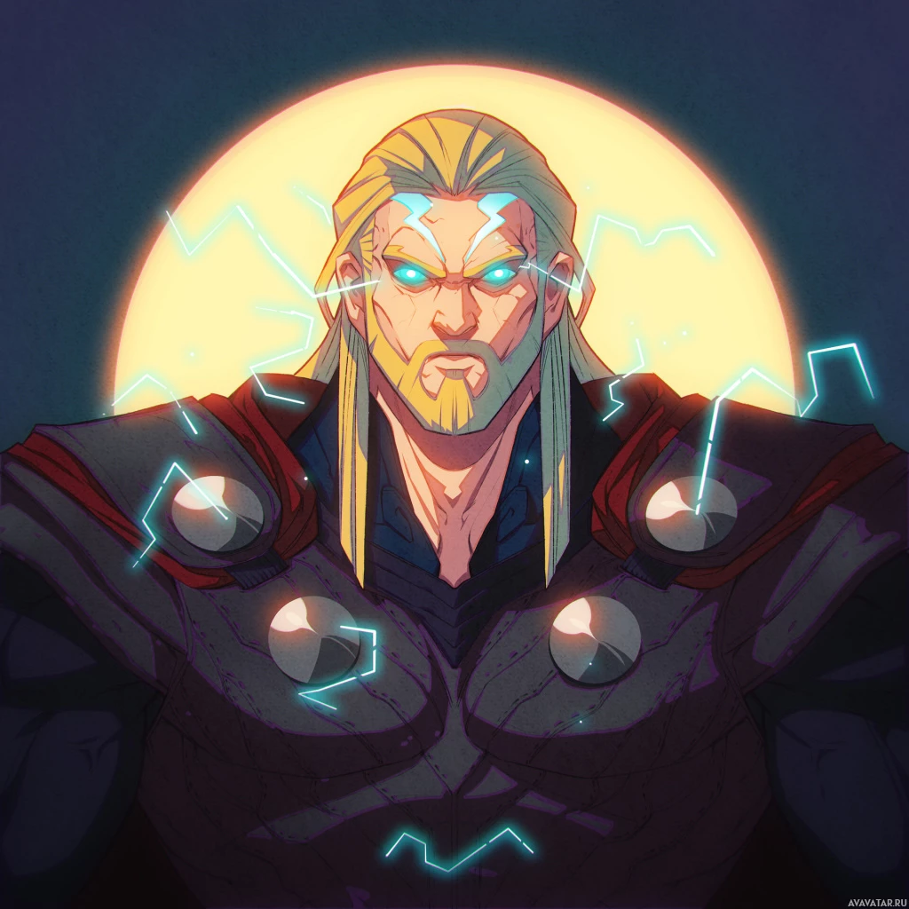 The image shows an illustrated depiction of Thor, a character from the Marvel Comics universe. He is known for his lightning powers and association with mythological elements like thunder and storms.