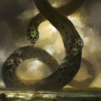 The image depicts a fantasy scene featuring a serpent-like creature with a skull at the head. It appears to be a piece of digital artwork with a dark, moody atmosphere, possibly representing a concept from mythology or fantasy literature. The setting seems to be a desolate landscape under a dramatic sky.