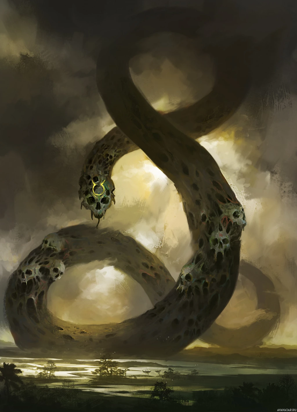 На картинке изображена фантастическая сцена, в которой фигурирует змееподобное существо с черепом во главе. Похоже, это цифровое произведение искусства с мрачной, угрюмой атмосферой, возможно, представляющее концепцию из мифологии или фэнтезийной литературы. Место действия - пустынный пейзаж под драматичным небом.