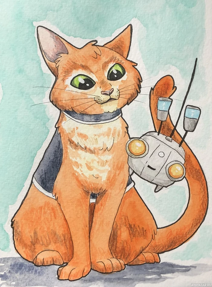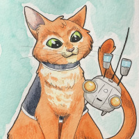 The image shows an illustration of a cat wearing what appears to be a robotic or technological device, possibly part of the "Stray"