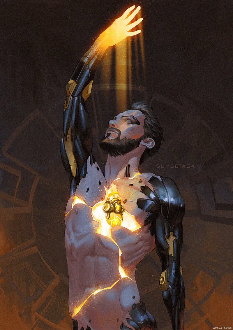 a thoughtful expression. His left arm, which seems to be a robotic prosthetic, is extended outward towards an unseen