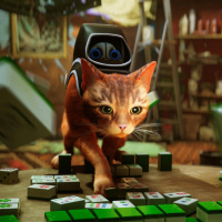 the main characters from "Stray," as it interacts with objects in a manner consistent with gameplay mechanics established by the game.