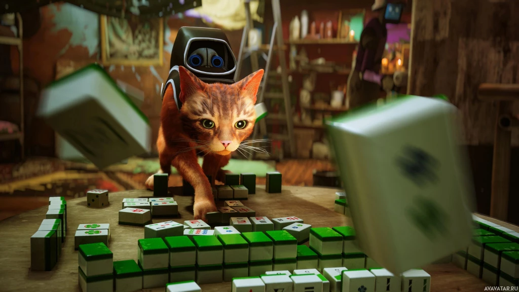 tabby cat is standing on top of a large number of green dominoes. The cat appears to be either playing or interacting with the dominoes in a room that resembles an alley or backyard setting. There are various objects scattered around, including what looks like