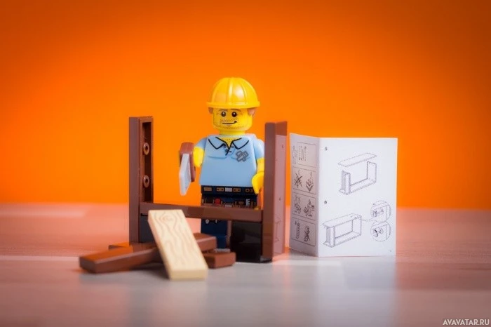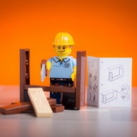 a LEGO figure that resembles the character from the movie "The Lego Movie," dressed in blue overalls, holding a hammer and surrounded by various building blocks. There is also a stack of instruction manuals for