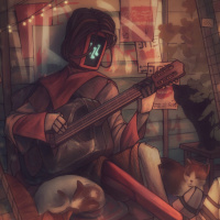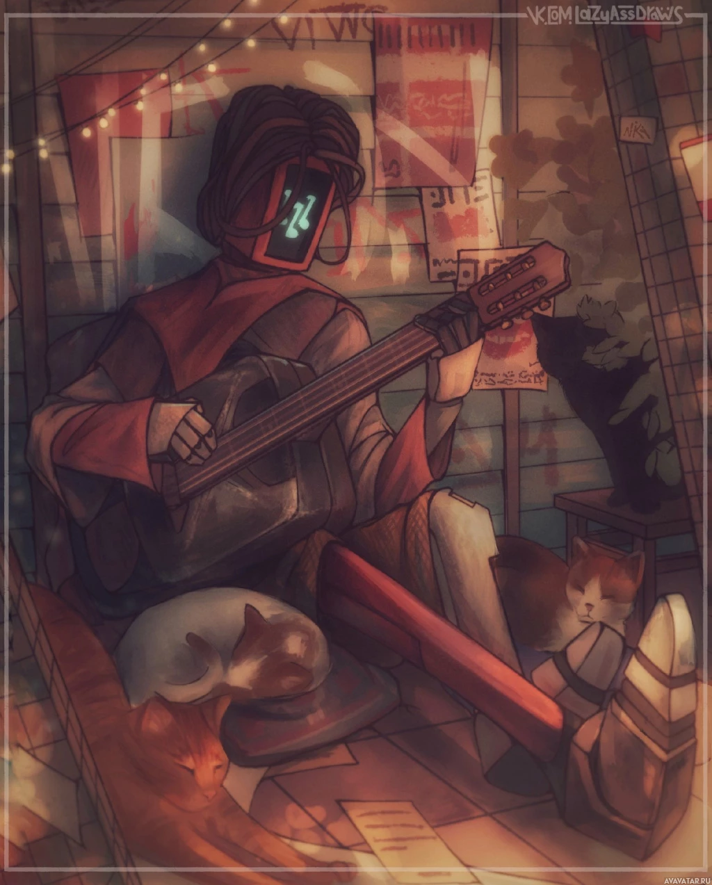 a humanoid design, wearing a backpack and holding a guitar. There are two cats nearby, one lying on the ground and another standing beside the character. The setting is dimly lit, with