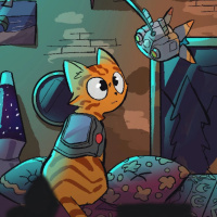 various objects scattered around like potted plants, vases, and books, along with what looks like a fishbowl on the windowsill that might be a decorative item or a piece of junk. The cat is wearing a small suit with a red