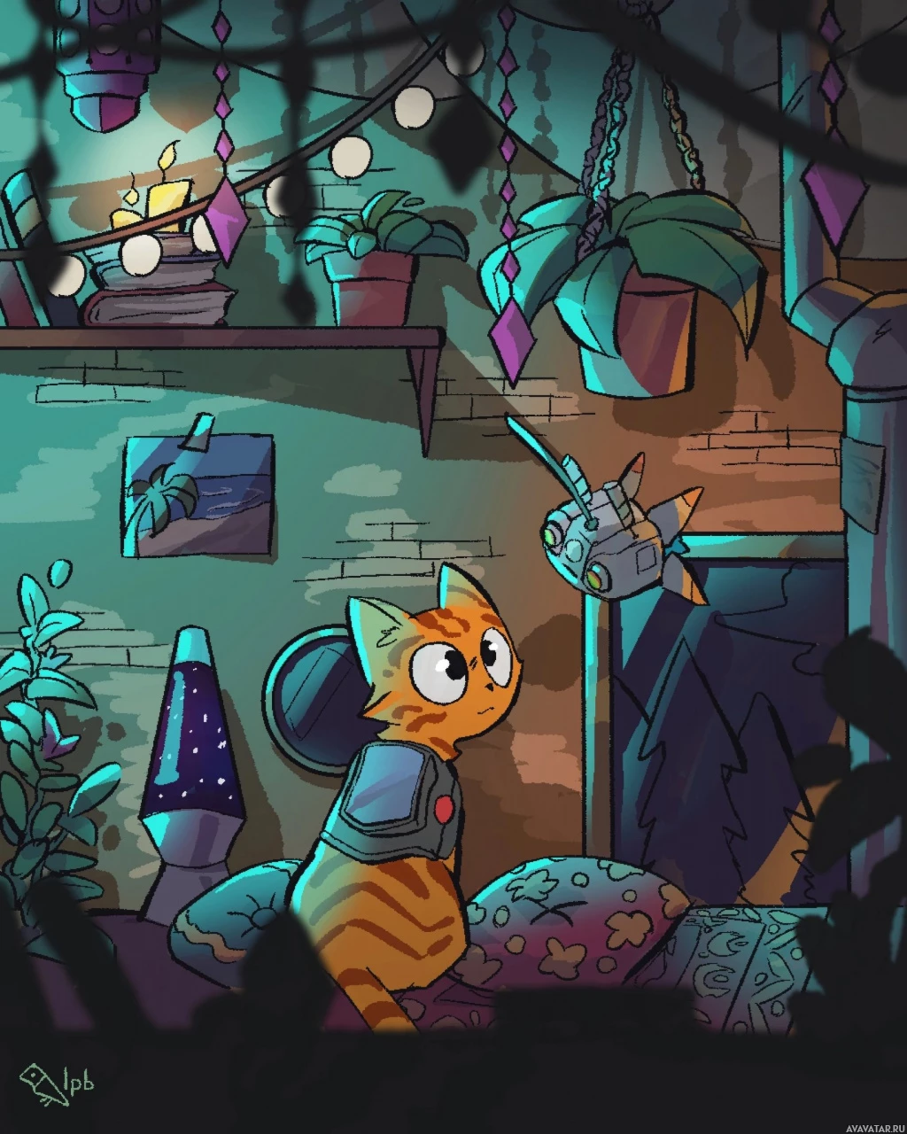 the video game "Stray." The setting is an old, dilapidated building with a jungle-like environment inside, suggesting a mix of