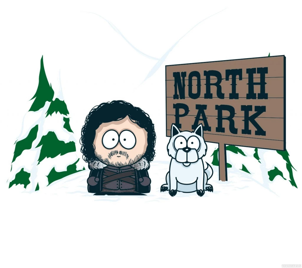 Game of Thrones, in a cartoon style reminiscent of South Park. He is standing beside a sign that reads "North Park," with snow-