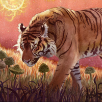 This image depicts a tiger. The tiger is standing on what appears to be grass, possibly in the wild or