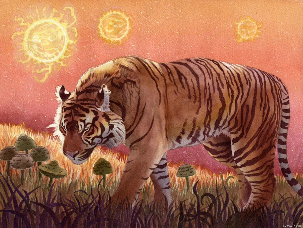 a savannah environment. The background features an orange-yellow sky with two bright suns, suggesting either