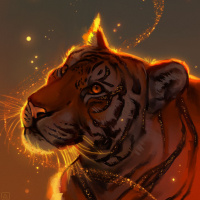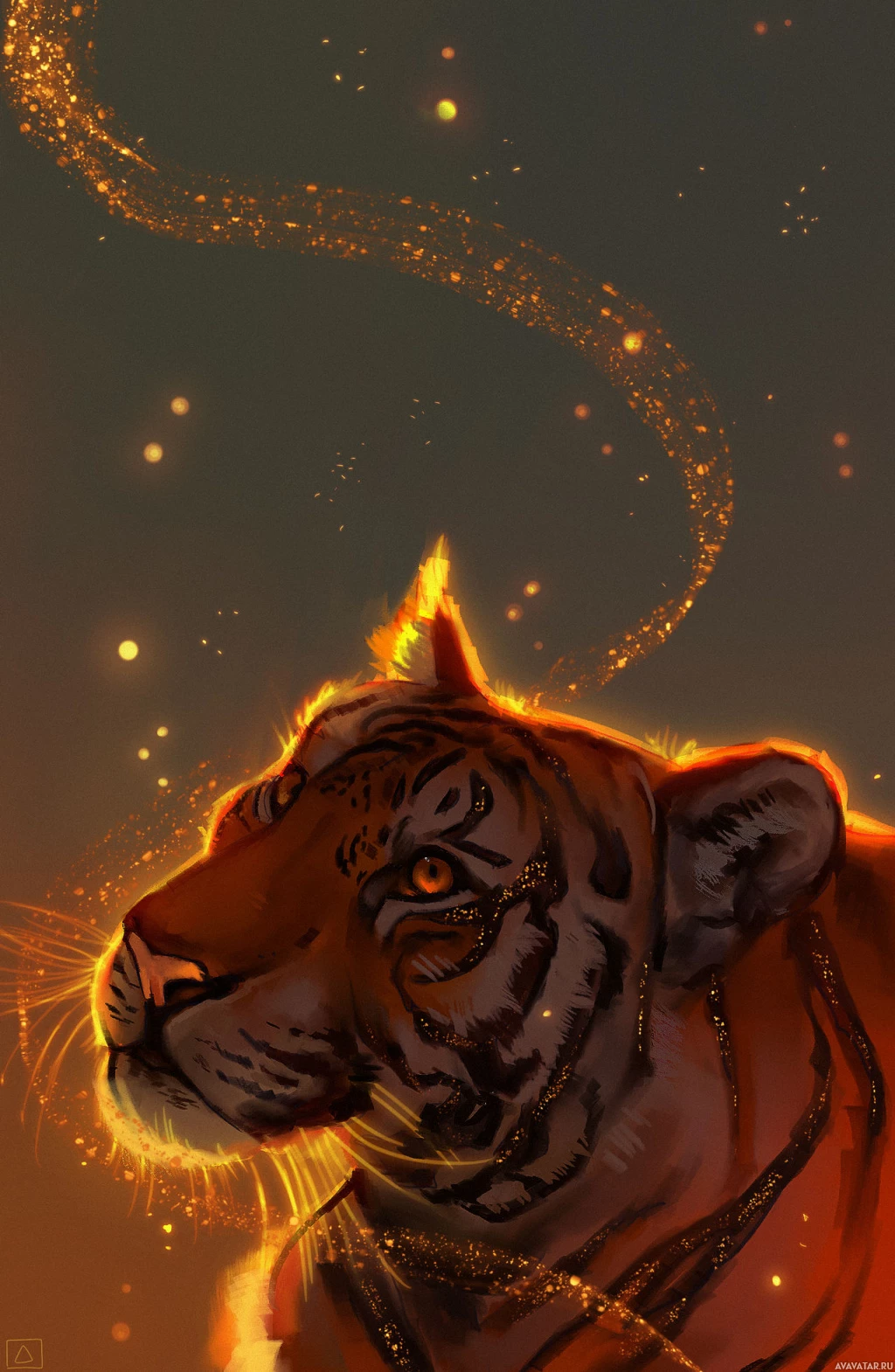 a night sky or a cave-like environment, while the tiger's face is illuminated by what appears to be magical or otherworldly light sources, giving it a glowing effect. Surrounding the tiger are particles that could be interpreted as stars or sparks, adding to the mystical theme of the image. The tiger itself has prominent stripes and is gazing towards the viewer with