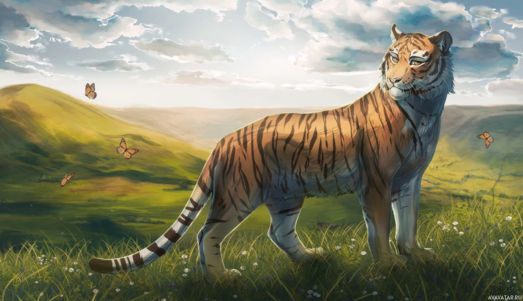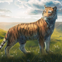 The image depicts a tiger standing in the grass. The background shows a clear sky and rolling hills, suggesting an open field or savannah environment, which is typical for
