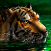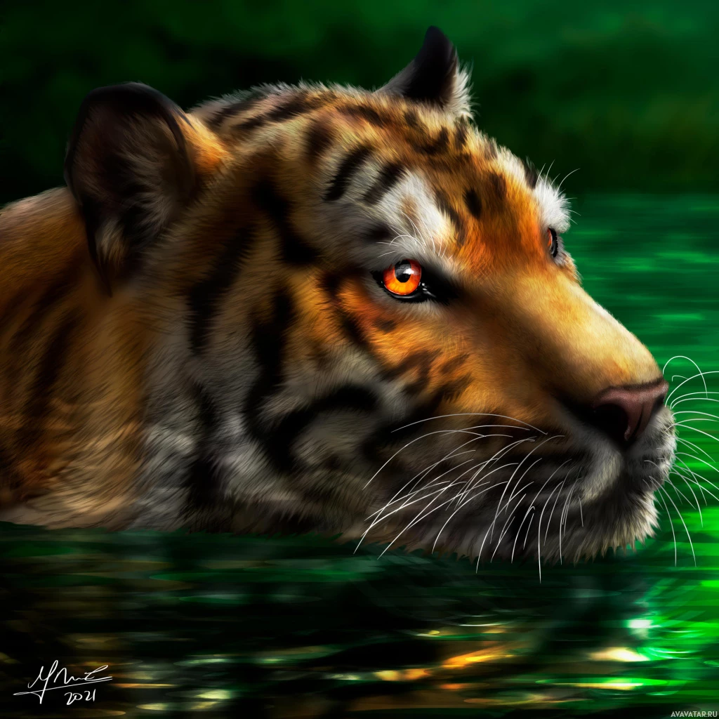 На картинке изображен тигр. Он изображен плавающим в воде с открытыми глазами и закрытой пастью. Обстановка выглядит натуралистичной, по краям изображения видна зелень.