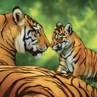 The picture shows two tigers, one adult and one cub, lying close together in a natural setting. It appears to be an artistic or realistic illustration rather than a photograph, as the details are too sharp for this type of image. The scene is serene and portrays the intimate bond between the adult tiger and its offspring.