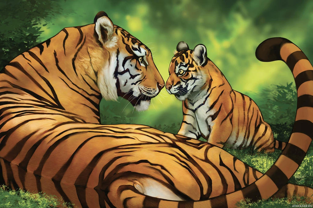 На картинке изображены два тигра, один взрослый и один детеныш, лежащие близко друг к другу в естественной обстановке. Это скорее художественная или реалистичная иллюстрация, чем фотография, поскольку детали слишком четкие для изображения такого типа. Эта безмятежная сцена демонстрирует тесную связь между взрослым тигром и его потомством.