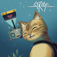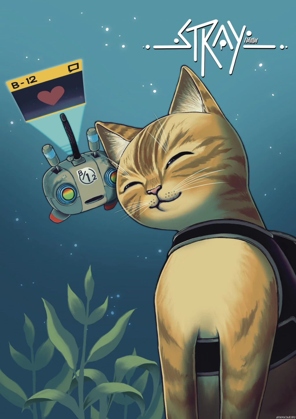 lush greenery. Next to the cat is a robot that appears to be from the game "Stray," based on its design and the context provided. The background suggests