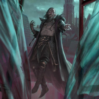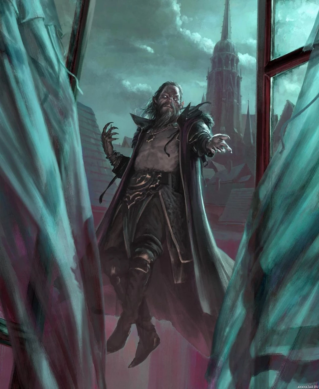 an intense pose, as if he is casting a spell or preparing for combat. The character is wearing a cloak and has a dramatic, gothic appearance with