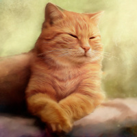 The image features an orange tabby cat sitting upright with its paws tucked in, giving it a relaxed and somewhat human-like pose. It appears to be looking directly at the viewer with a calm expression on its face. The background is softly blurred but suggests a natural outdoor setting with green hues.