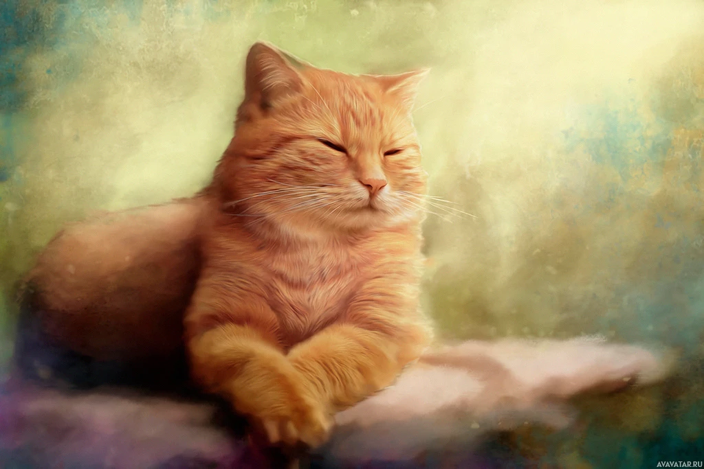 На картинке изображена оранжевая полосатая кошка, сидящая прямо, поджав лапы, что придает ей расслабленную позу, немного напоминающую человеческую. Кажется, что она смотрит прямо на зрителя со спокойным выражением лица. Фон слегка размыт, но напоминает естественную обстановку на открытом воздухе с зелеными оттенками.