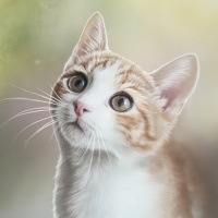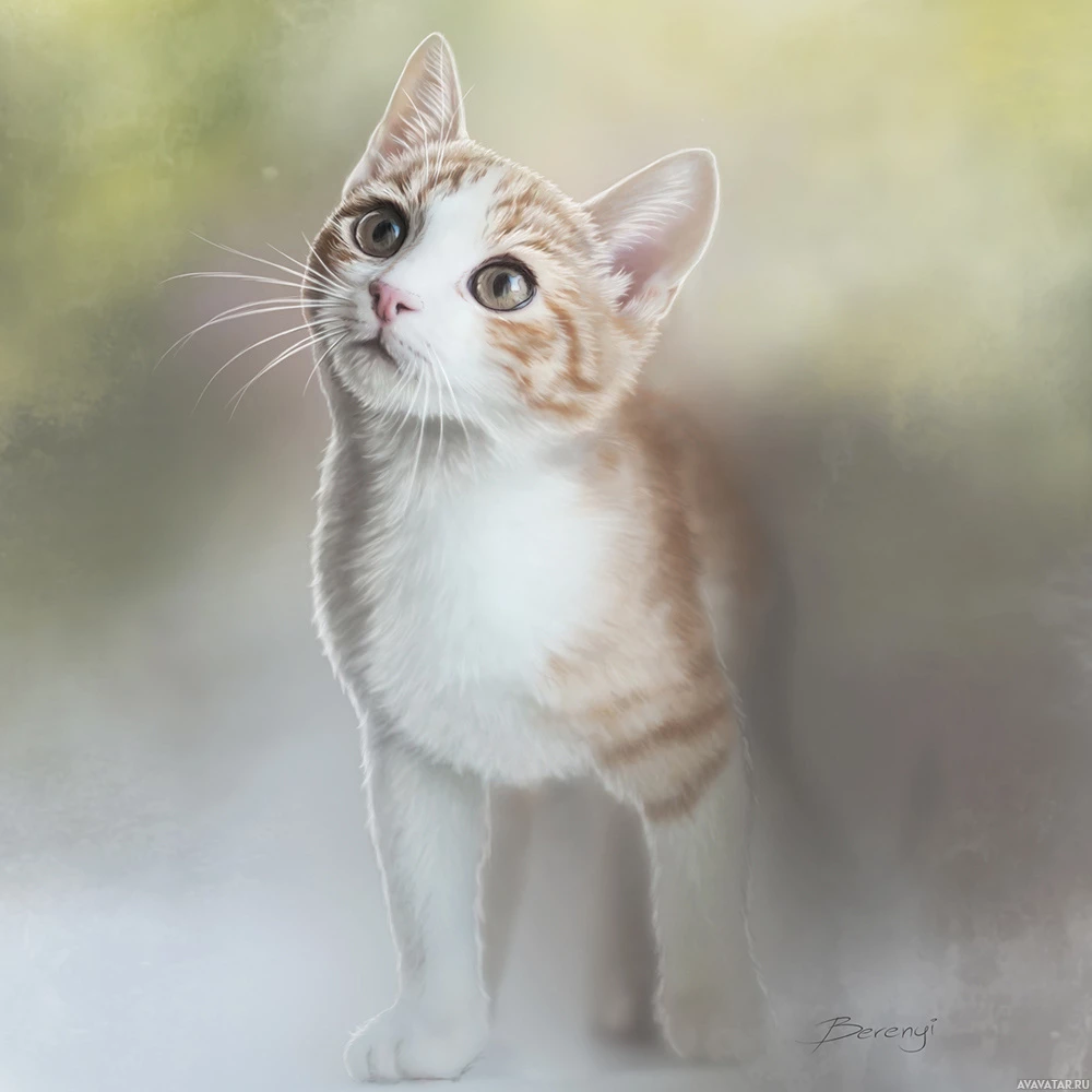 striking eyes. It appears to be looking upwards, possibly observing something in the distance or just curious about its surroundings. The background is softly blurred, which brings focus to the kitten and gives the photo a gentle, almost ethereal quality.