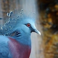 red eyes that stand out against the darker feathers. The background is blurred but appears to be