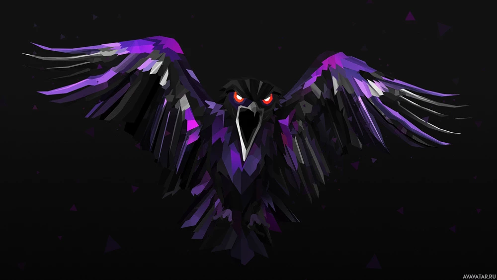 На снимке изображена стилизованная художественная фигура вороны. Он выполнен в замысловатом дизайне с использованием фиолетовых и черных цветов, что придает ему оттенок абстракции или цифрового искусства. Это не настоящая фотография, а скорее графическая иллюстрация или логотип.