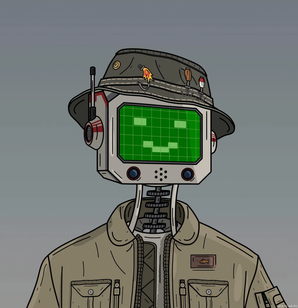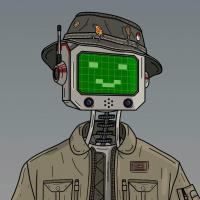 robot character wearing what appears to be a military-style jacket, complete with badges and patches. On the robot's head is a small screen displaying a green pixelated