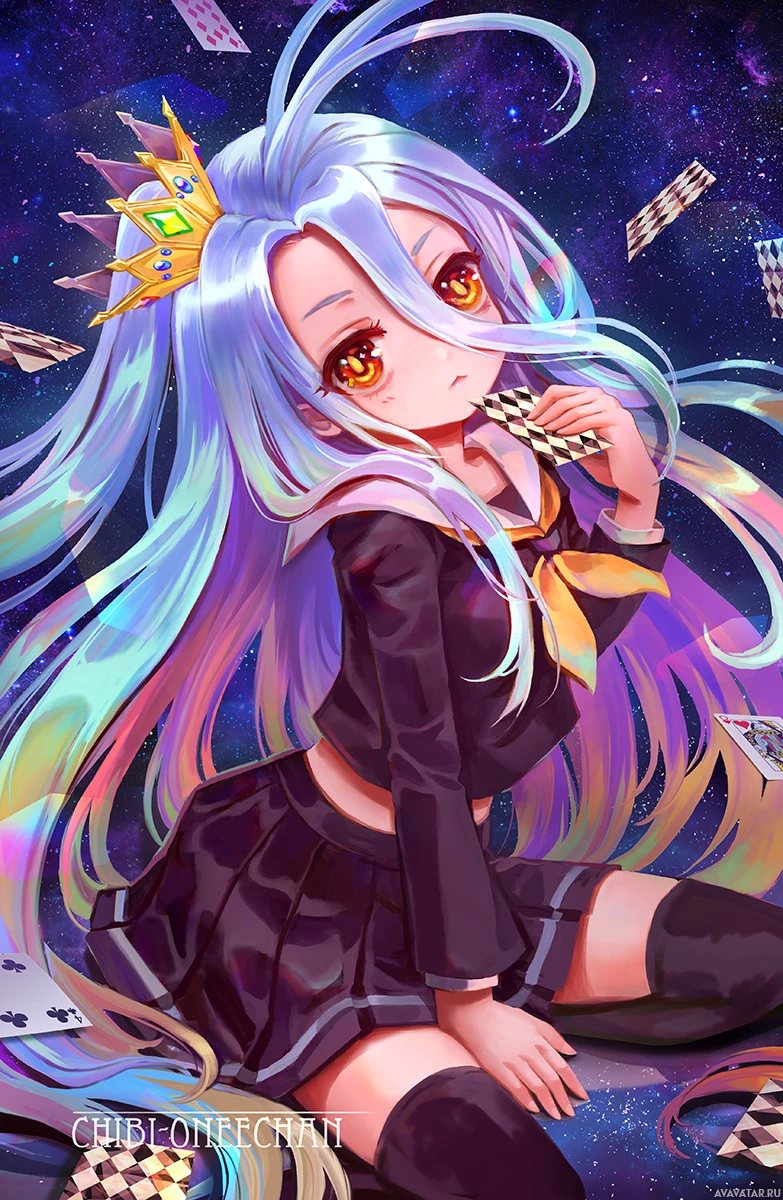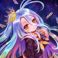 school uniform and has what looks like a tiara on her head. The background suggests a space setting, possibly a galaxy or