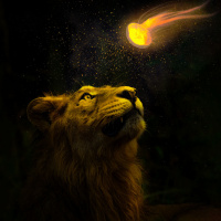 The image shows a lion sitting in what appears to be a forest setting at night. The lion is looking upwards with its mouth open, as if it is either growling or roaring. Above the lion's head are two small yellow lights that could represent stars, and there are