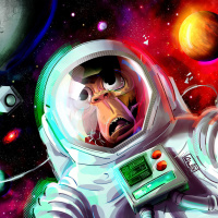 a space suit, which resembles the attire of an astronaut. The background is a vibrant and colorful illustration of