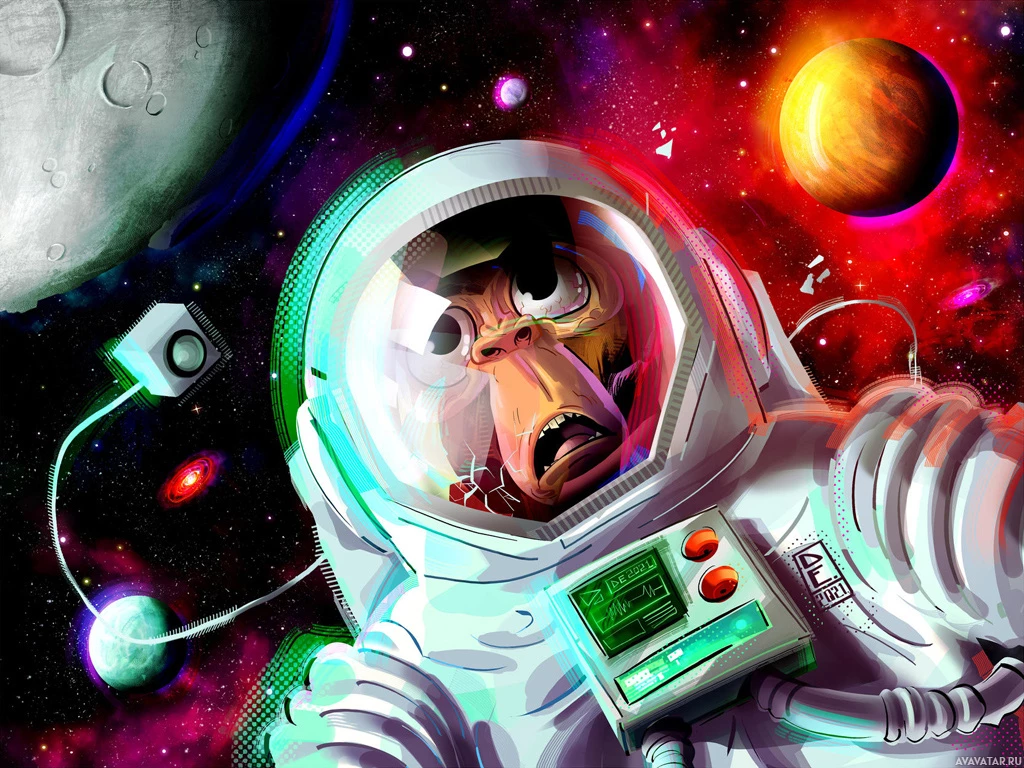 outer space, with various celestial bodies such as planets and moons visible in the distance. The monkey appears to be engaged in