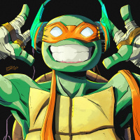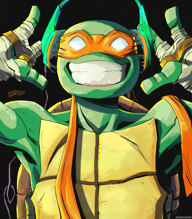 Это иллюстрация Микеланджело, одного из черепашек-ниндзя. Он изображен в наушниках, с радостным выражением лица и поднятыми над головой руками, как будто он взволнован или празднует.