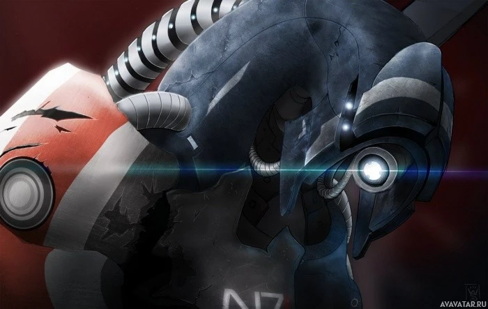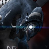 the video game "Mass Effect," which is a science fiction action role-playing game series developed by Bioware. The central figures are characters from the game, which feature