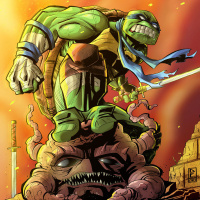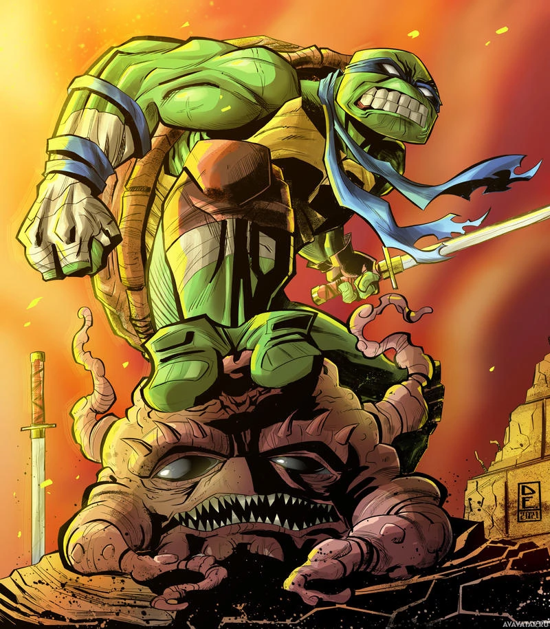 turtles in the series. He is shown wielding a sword and standing confidently over a defeated enemy, which appears to be Krang, a prominent villain from