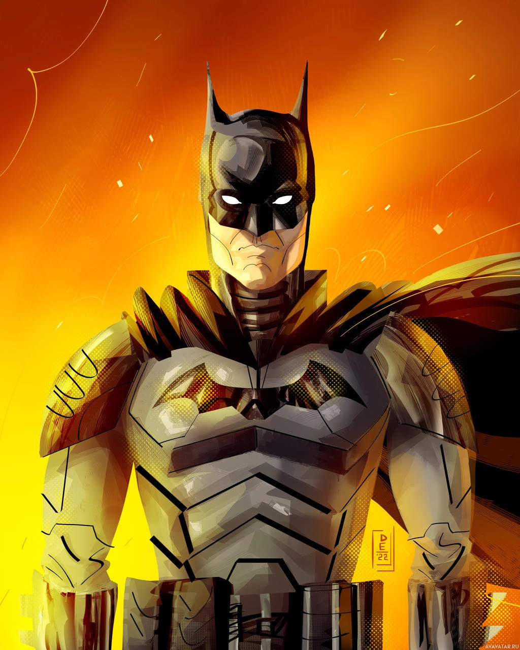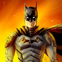 iconic costume, which includes a cowl, cape, and emblem on the chest. The background suggests