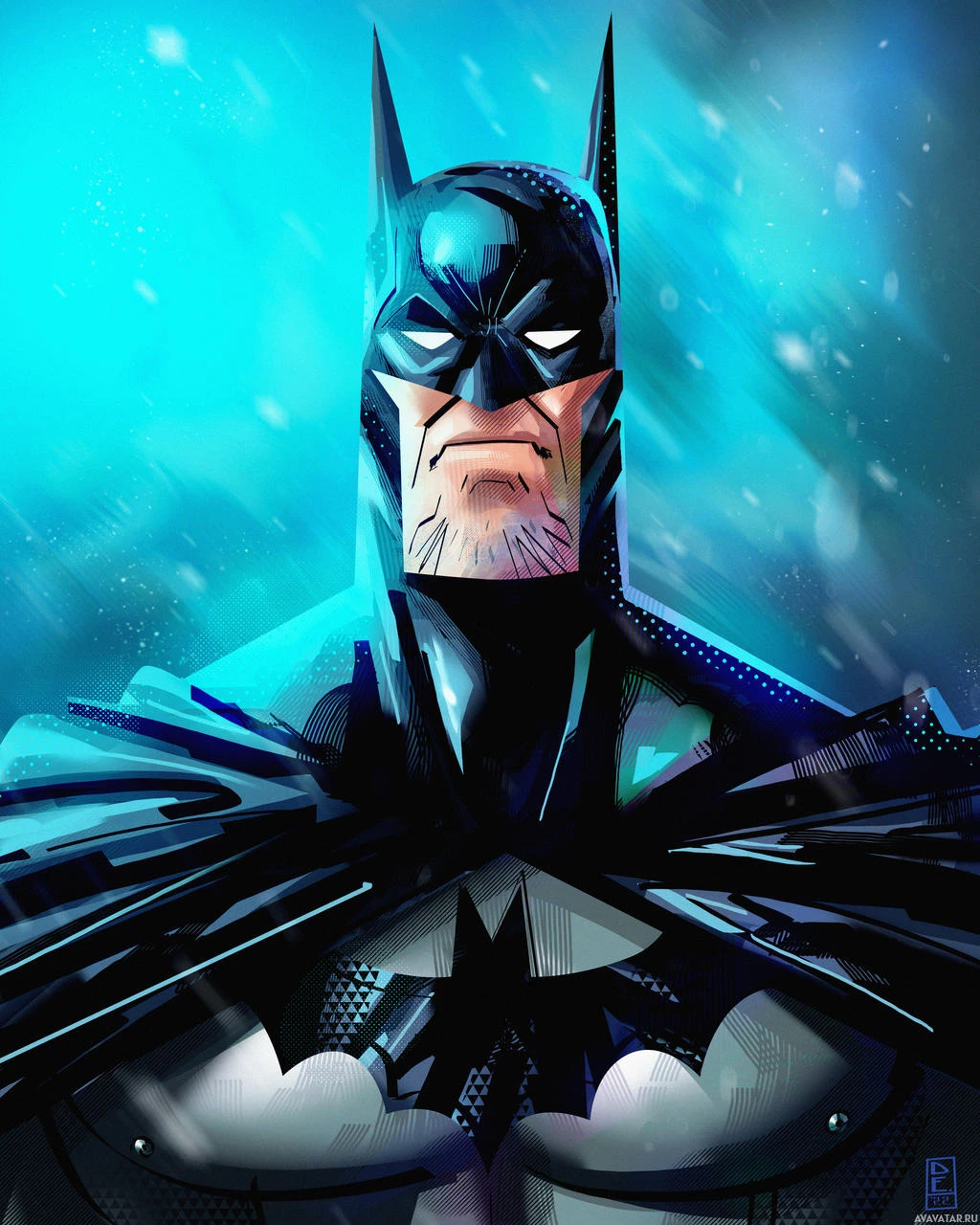 intense gaze are characteristic elements of the Batman persona. This artwork captures the essence of the beloved comic
